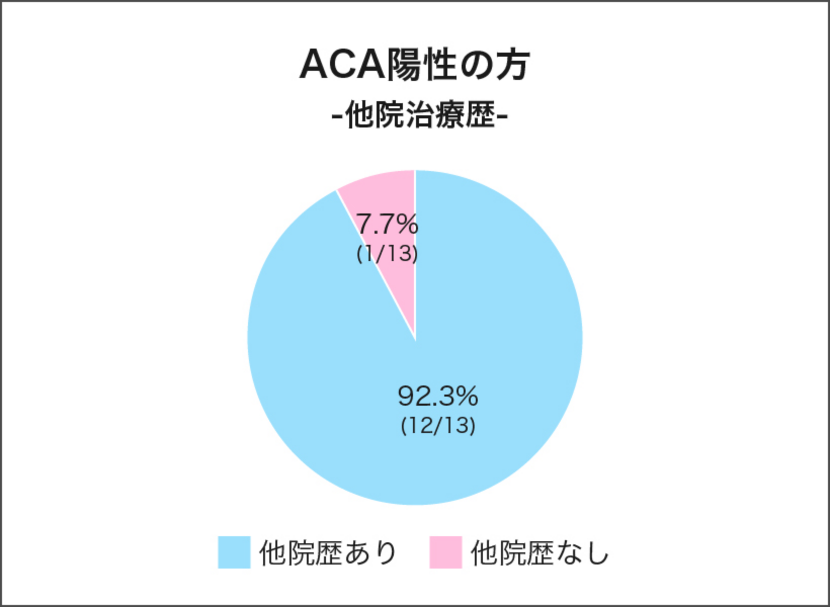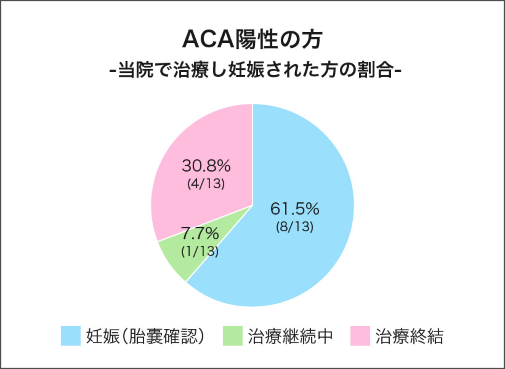 このような背景から、ACA陽性の方は、1回の採卵で得られる正常受精卵数が少ない傾向にあり、治療が長期化・難航する場合もあります。また、当院で治療されたACA陽性13名のうち12名(92.3%)は他院での体外受精治療歴があり、その中には、ACAの検査を受けていない、あるいは原因不明のまま治療が進められていた患者様も含まれていました。