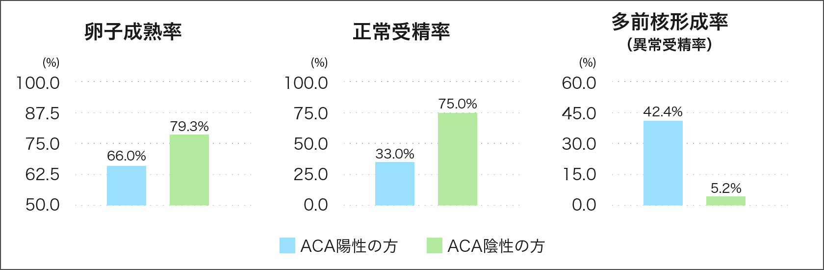 ACA陽性の方は、ACA陰性の方に比べて、卵子の成熟率が低く、正常受精の割合が低く、多前核形成の割合が高い傾向がしばしば見られます。(下図の当院データ)
