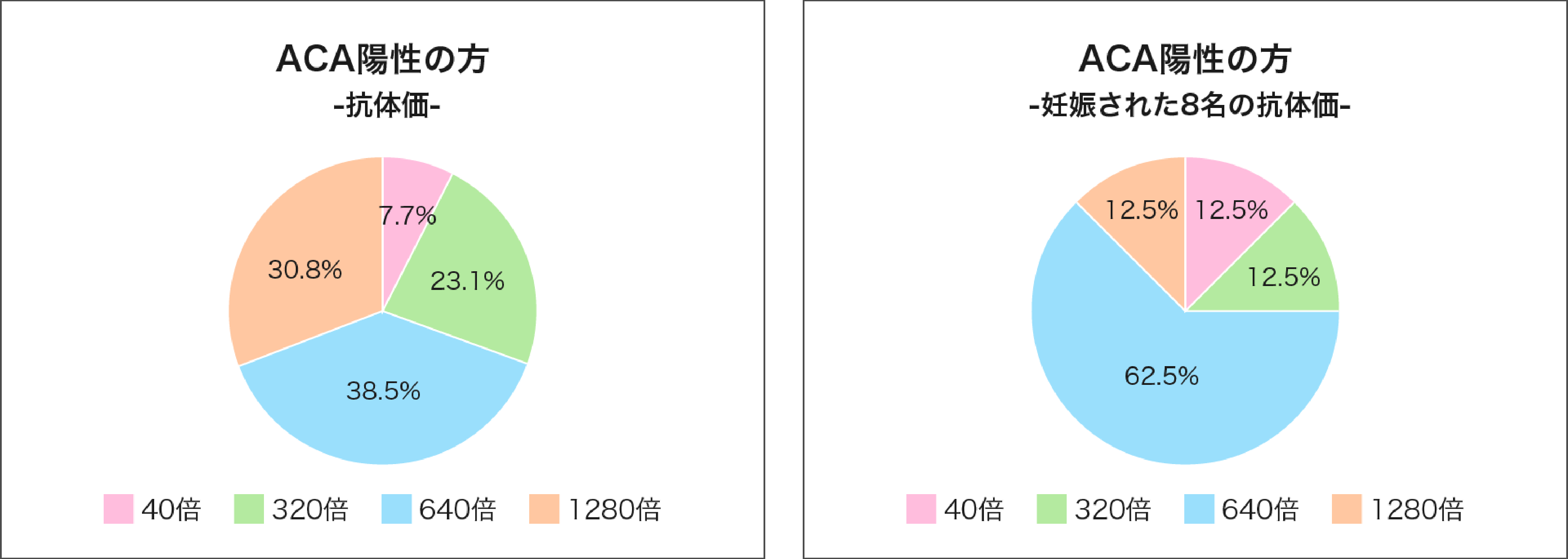 しかし、当院で妊娠に至った8名のACA陽性の方の抗体価を見てみると、抗体価640倍以上という高値を示す方も複数含まれていました。つまり、抗体価の高さだけで妊娠の可能性を否定することはできません。